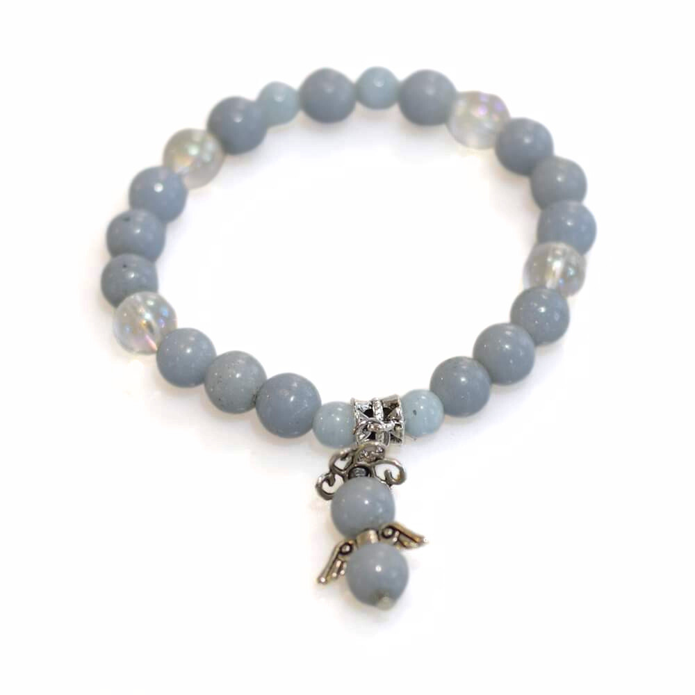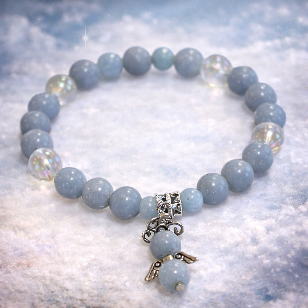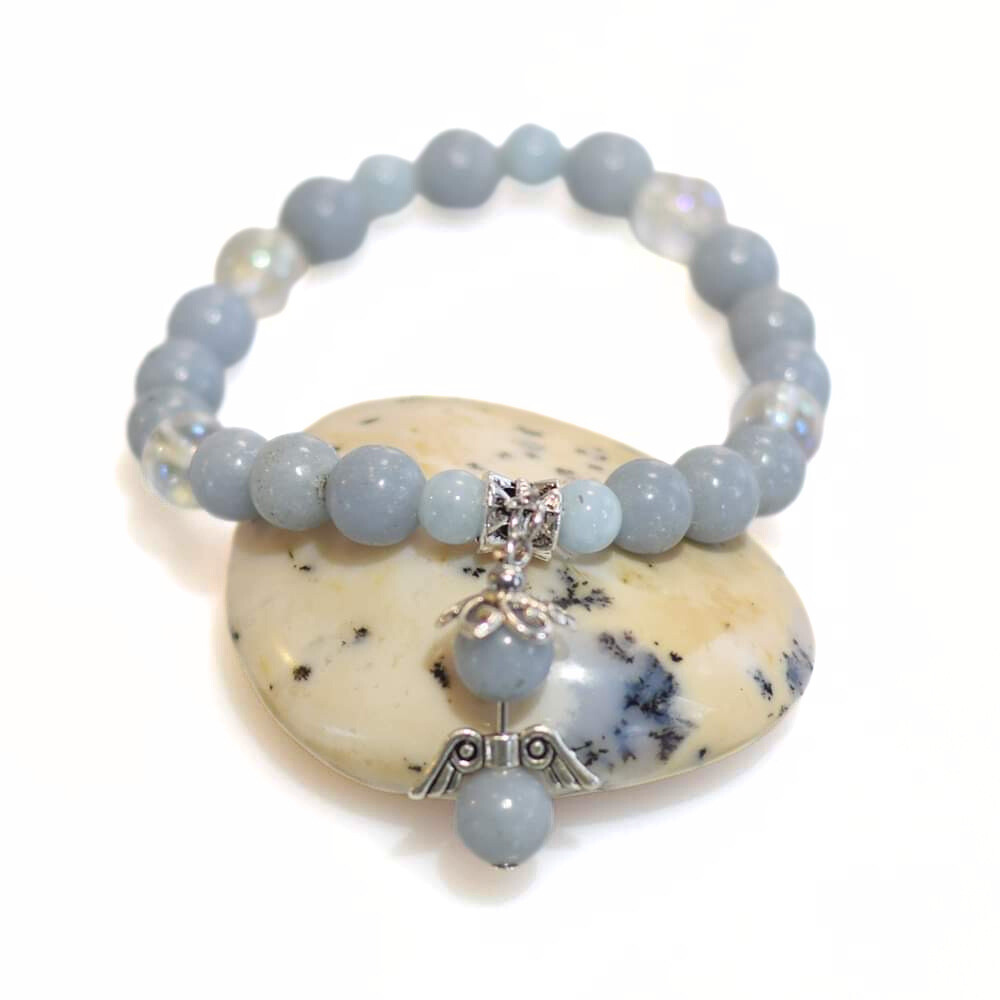 Az ékszer 8 mm-es angelit és angyal aura hegyikristály gyöngyökből készült.